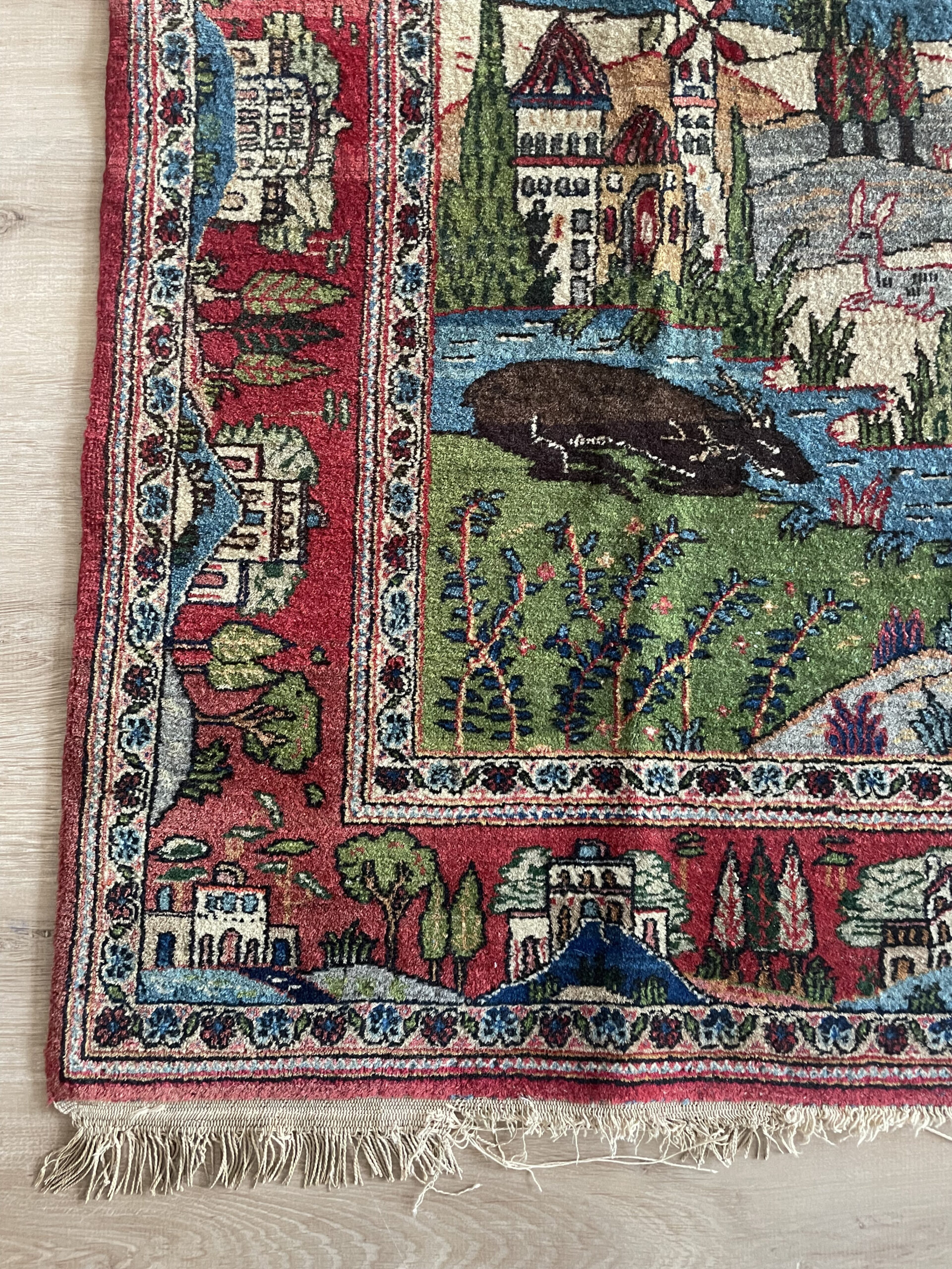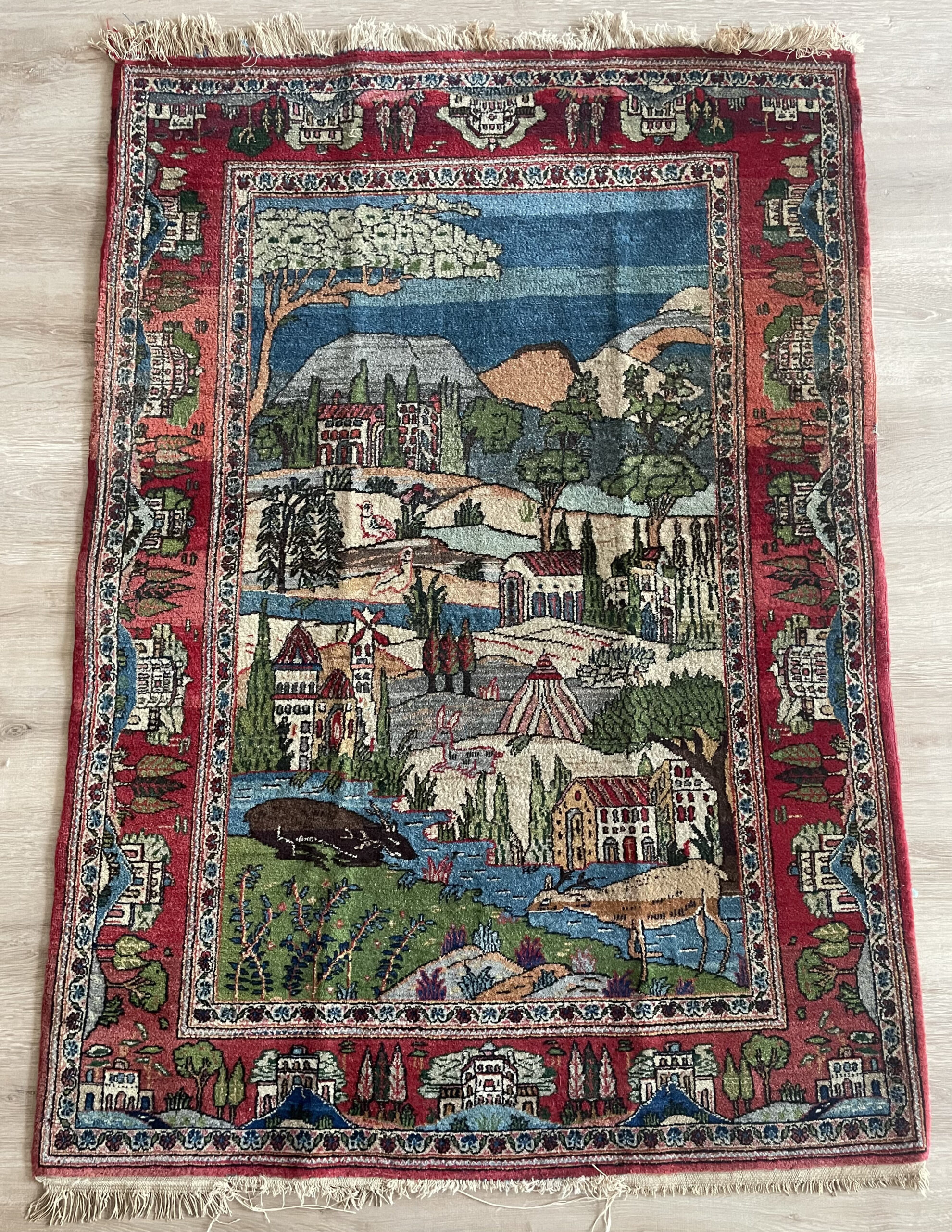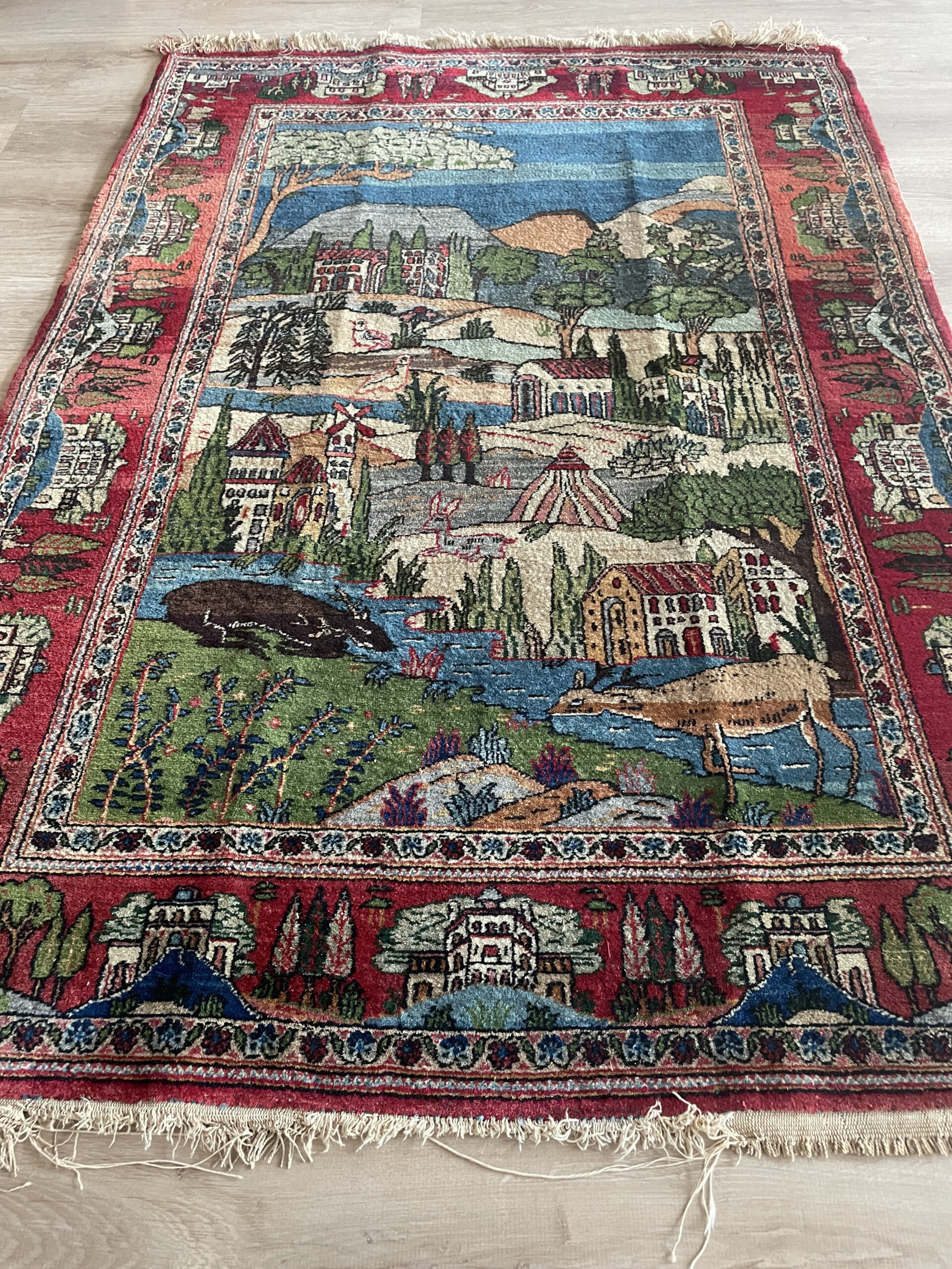 سجادة  فارسيه كاشان  أنتيك   مايميز السجاده اللون الفاقع الجميل كذلك يمثل تصميم السجاده حقبة التصاميم التي كانت منتشره في القرن ال التاسع عشروهو منظر طبيعي لمدينة كاشان مع المباني و الحيوانات  ما يميز السجاده أنه تم حياكتها بإتقان شديد حيث يبلغ حجم الغرزه ٢٨٠ غرزه بالمربع ، و السجاده بحالتها للأصلية  وهي مصنوعه  من صوف  الخروف الصغير الكرك  والشراشيب مصنوعه من  القطن السجاده مصنوعه من الألوان الطبيعيه